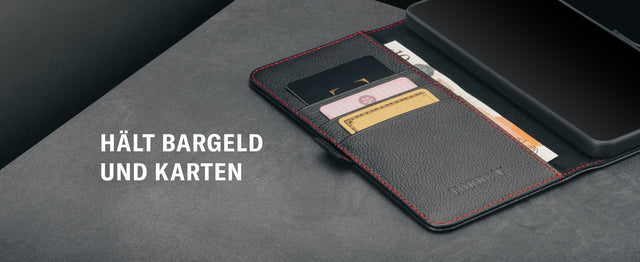 Die Galaxy S26-Hülle verfügt über eine integrierte Standfunktion für die horizontale Nutzung des Bildschirms. Sie bietet außerdem drei Kreditkartenfächer sowie ein größeres Fach für Geldscheine. Der seitliche Magnetverschluss sorgt für sicheren Halt und ein schlankes Profil.